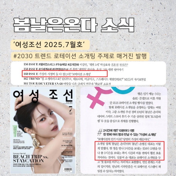 소식 3. 여성조선 2025년 7월호 매거진 발행 '가성비, 시성비 둘다 잡는다! 로테이션 소개팅' 인터뷰 내용 발행