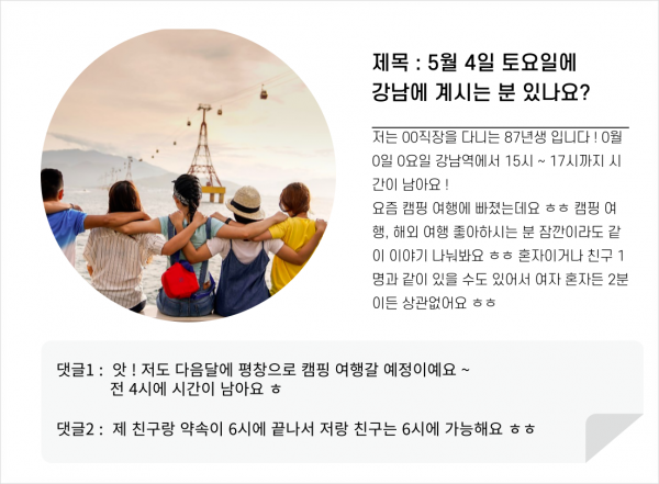 - 쪽지 또는 오픈카톡방 링크를 올릴때는 집결 가능한 일정/장소를 공유해주세요 :)